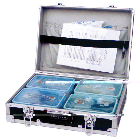 该箱采用的方法是将各种腐蚀性化学试剂分别封装在安培瓶里。再将安培瓶封装在塑料套内。使用时将安培瓶打碎使试剂混合,用剪刀剪开塑料管封口,溶液从开口流出,点注在潜在金属字迹上,将潜在金属字迹显出,产品通过相关部门的检测。