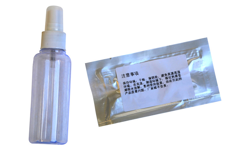 向喷瓶注入125ml清水,将1片试剂A和1片试剂B放入喷瓶,晃动喷瓶,直至试剂全部溶解。