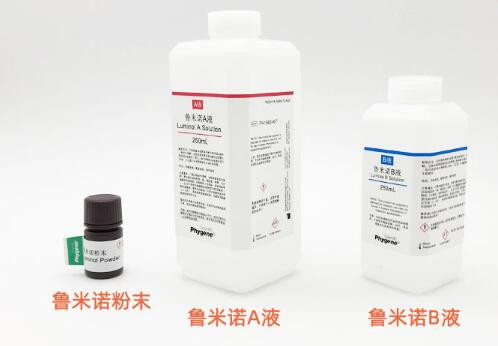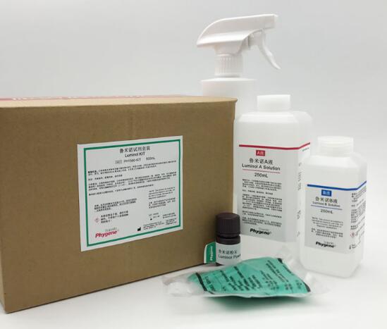 套装内含:鲁米诺粉末1瓶、鲁米诺A液90 mL/瓶、鲁米诺B液90 mL/瓶、喷雾头1个、手套1副